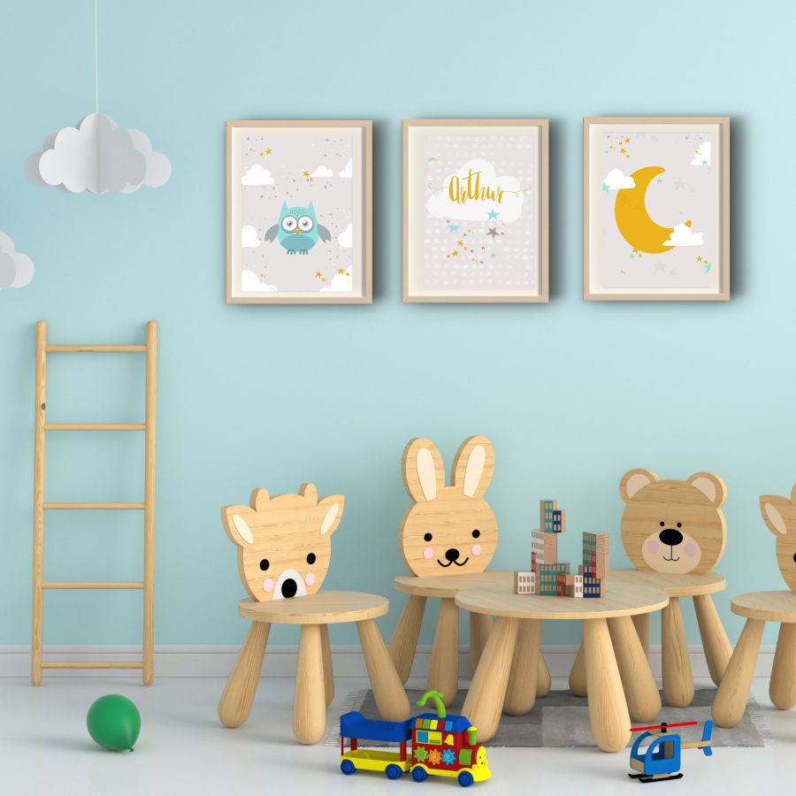 3 Affiches à encadrer hibou -nuage - étoiles