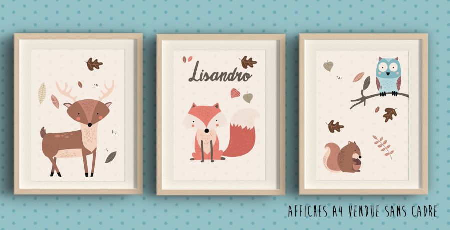 3 Affiches à encadrer thème Forêt cerf renard chouette & écureuil