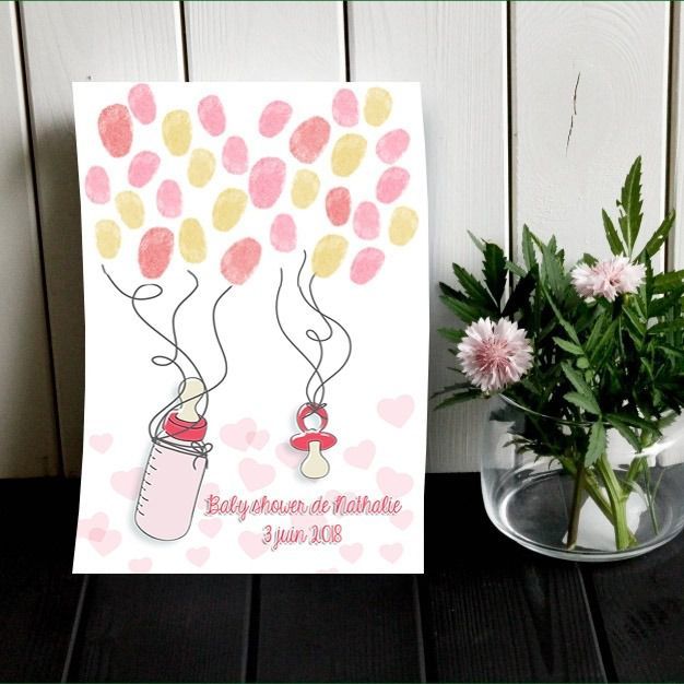 Affiche à empreintes Tétine et biberon pour baby shower (rose)