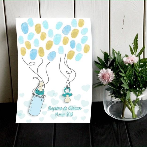 Affiche à empreintes Tétine et biberon pour baptême (bleu)