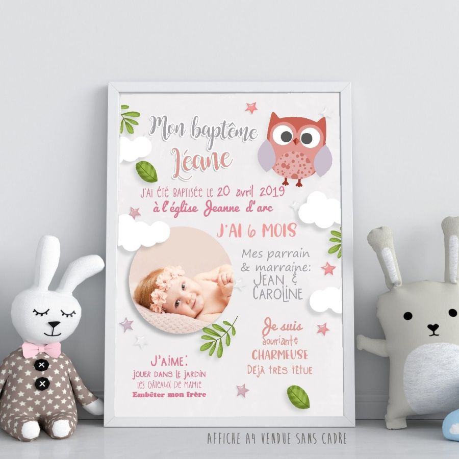 Affiche de baptême personnalisée à encadrer - Chouette - Rose