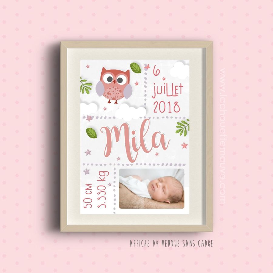 Affiche de naissance personnalisée à encadrer - Chouette