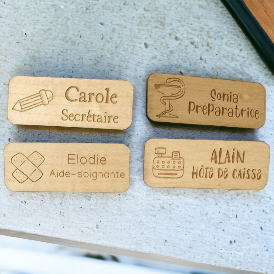Badge en bois rectangulaire à personnaliser pour métiers du médical | vendeurs | comptables | secrétaires | psychologues | animateurs | puériculteurs etc...