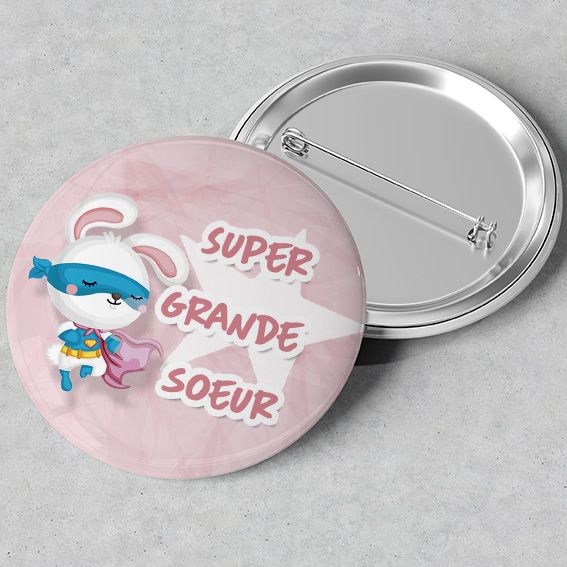 Avec ce petit badge Super grande soeur en mode héroïne, faites lui faire le plein de confiance pour bichonner avec soin son futur petit frère ou sa future petite soeur.