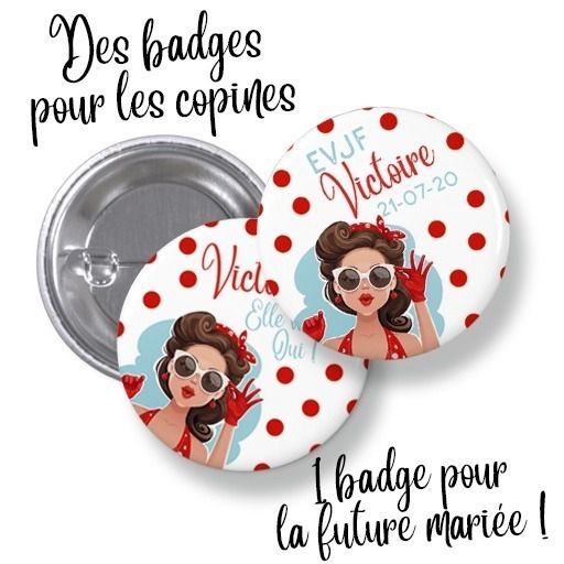 Badges ronds modèle Pinup, à porter le jour de l’événement et à garder ensuite pour un souvenir de la journée !