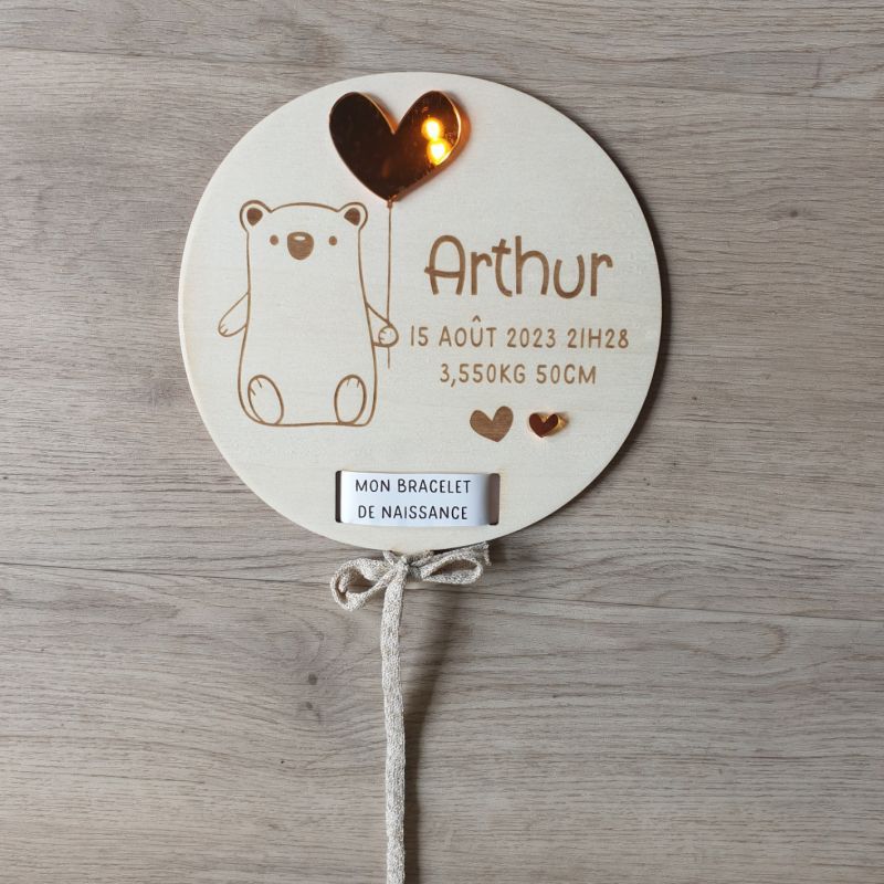 Ballon de naissance en bois et or Ourson avec bracelet de naissance