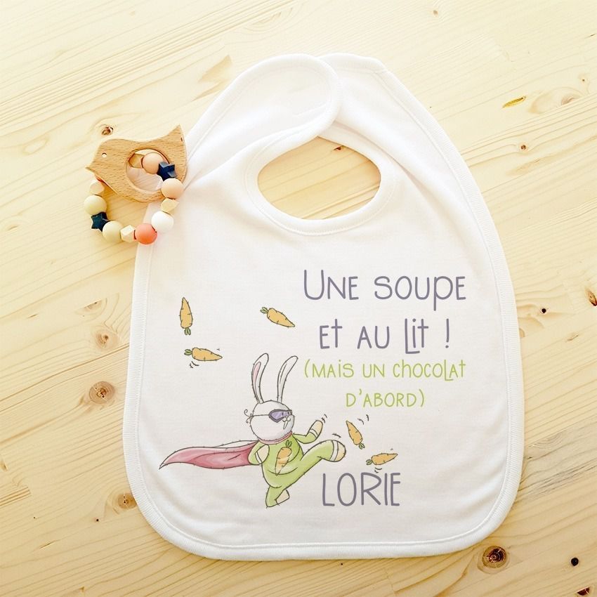 Couleur de la bordure du bavoir au choix (blanc, bleu ou rose).
