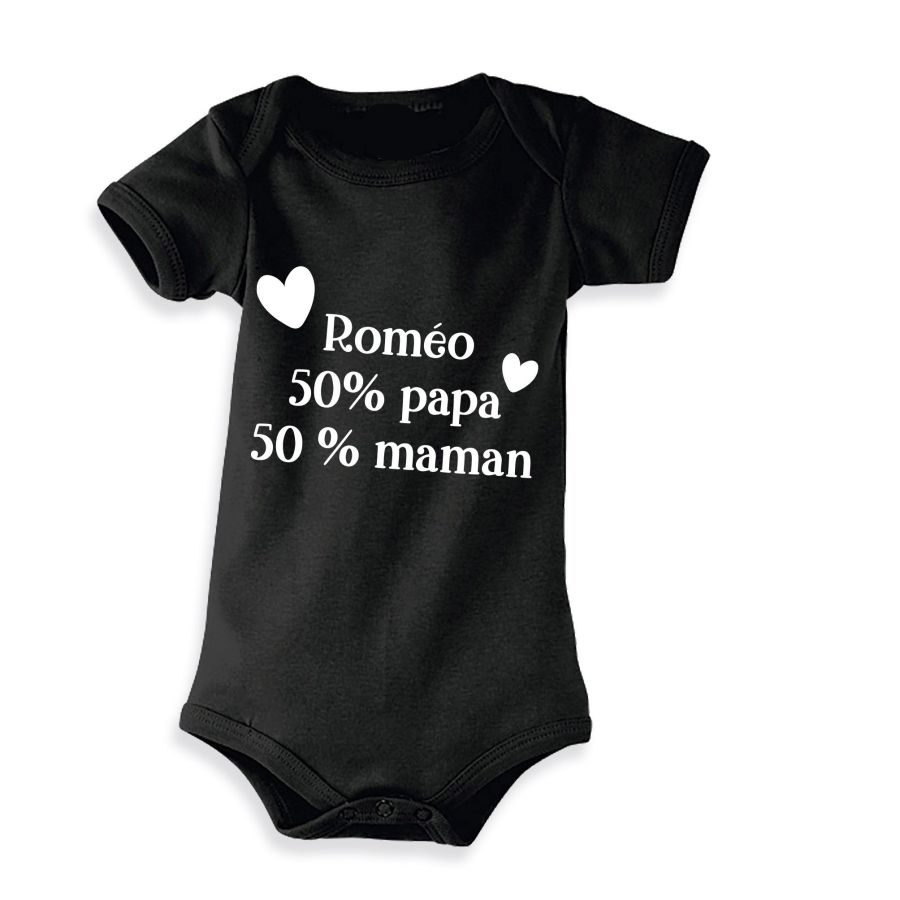 Body personnalisable le prénom de bébé, avec l'inscription 50% papa 50% maman
