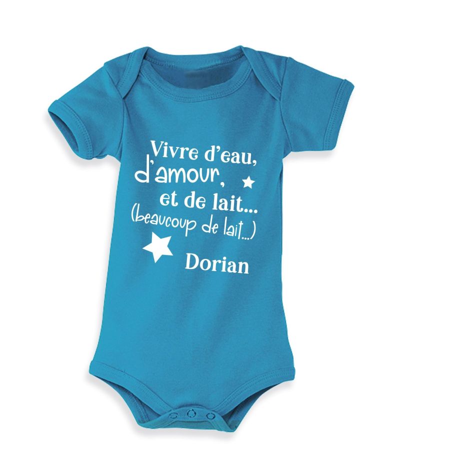 Body personnalisable le prénom de bébé, avec l'inscription Vivre d'eau, d'amour et de l'ait (beaucoup de lait)