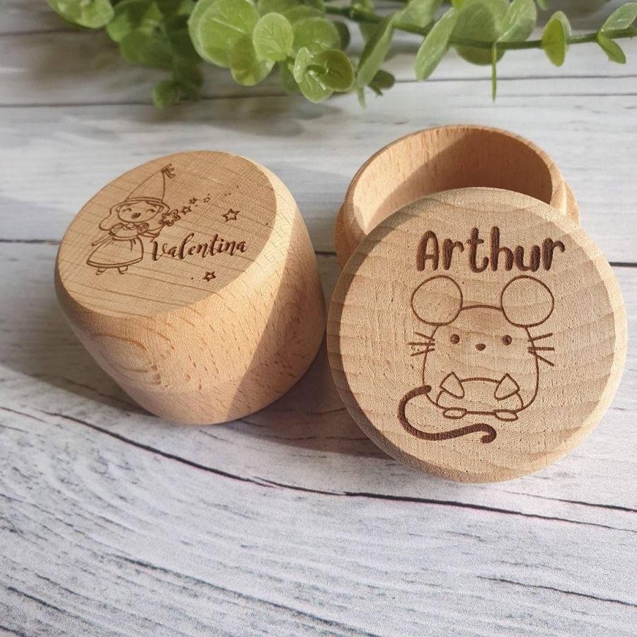 Petite boite à dents ronde en bois brute, décorée et gravée avec le prénom de l'enfant.