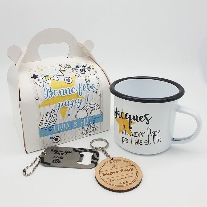 Une tasse émaillée personnalisée avec le prénom du papy et le(s) prénom(s) des petits enfants (rebord noir ou argenté)