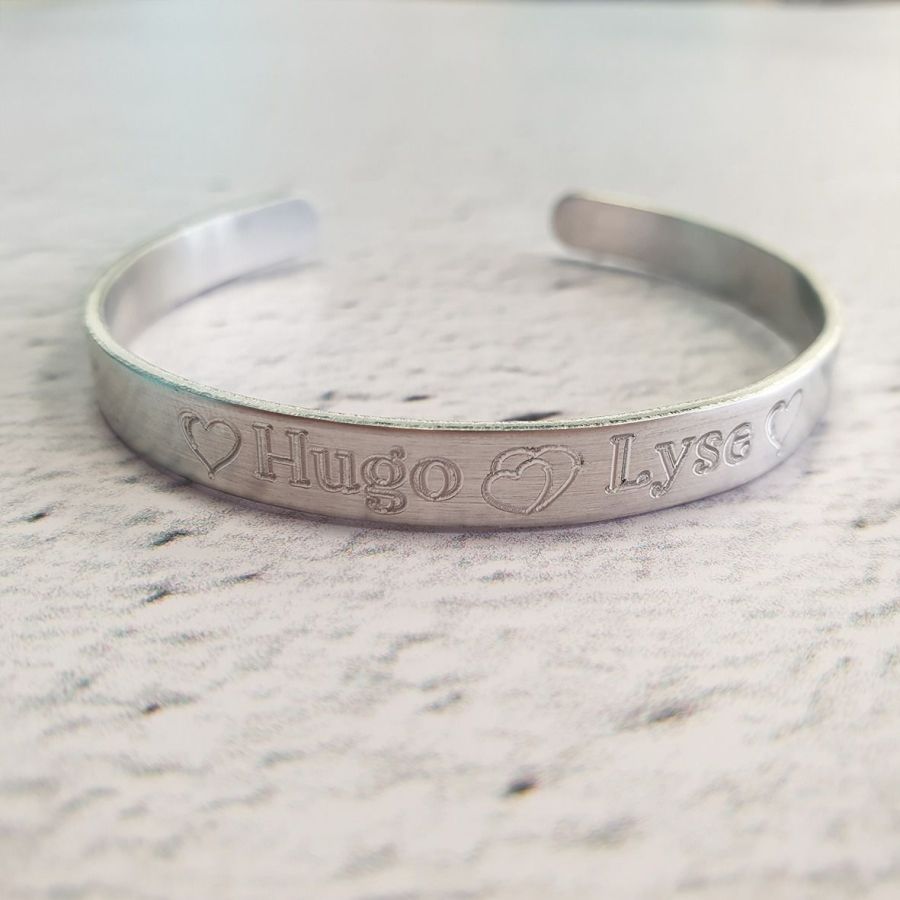 Bracelet en aluminium gravé et personnalisable avec soit prénom(s) ou date de naissance ou petite phrase de 30 caractères maximum espaces et motifs compris