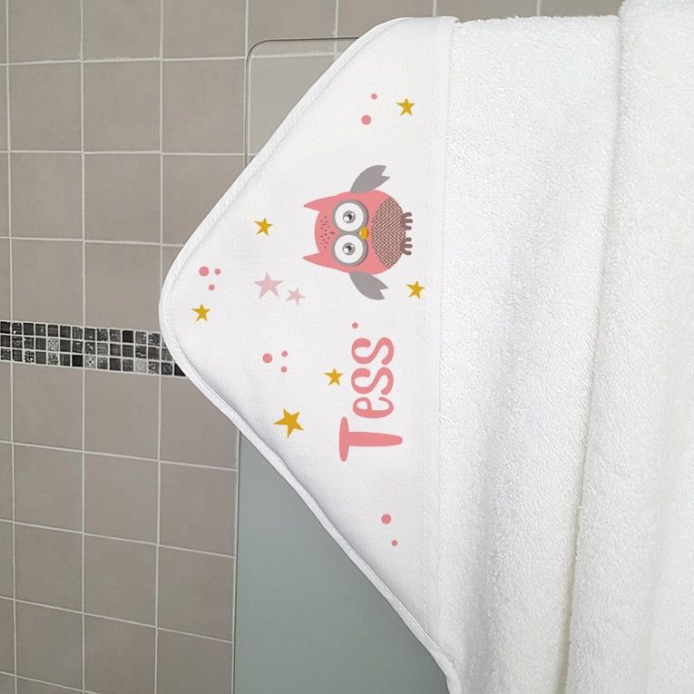Cape de bain personnalisée en éponge | pour enfant | avec prénom | modèle Chouette rose 2