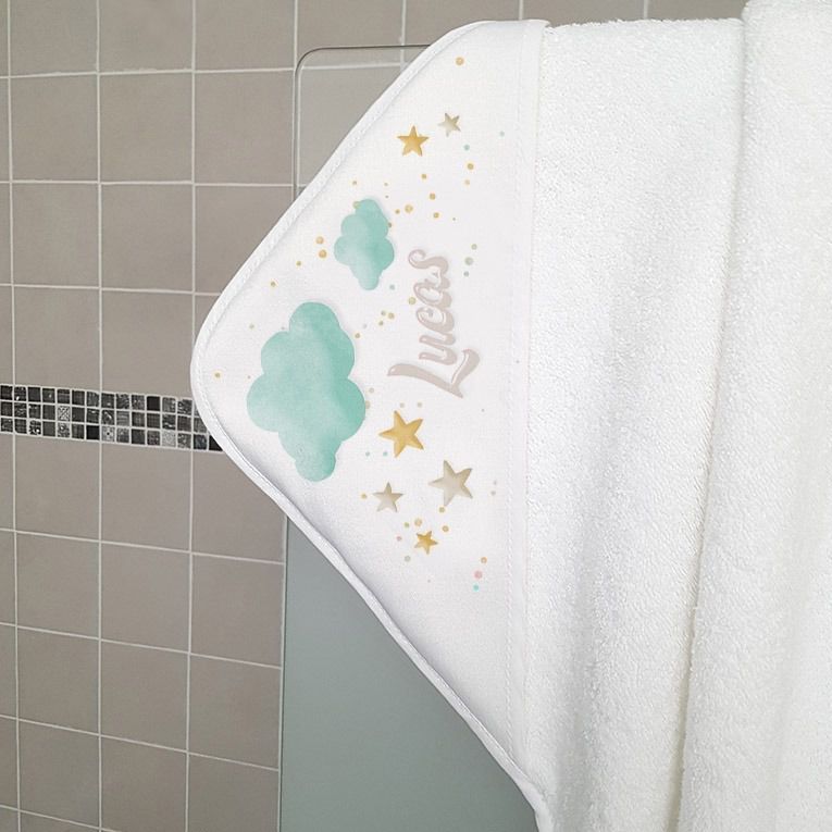 Cape de bain modèle nuage pour envelopper bébé à la sortie de son bain.