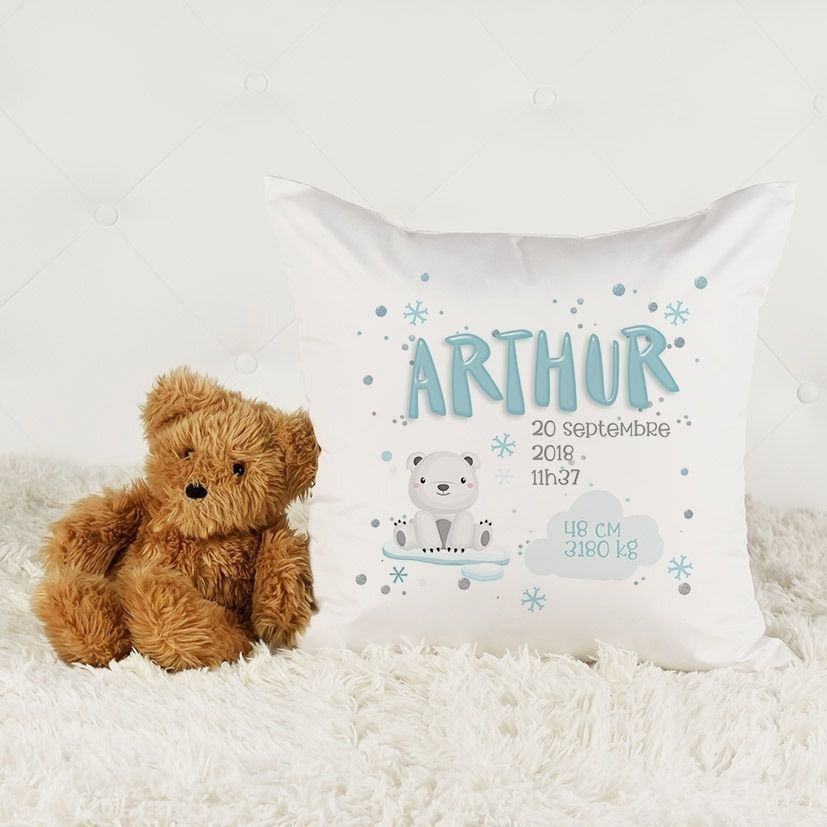 Ce coussin est à personnaliser avec les informations de l'enfant (Prénom, poids, taille, date de naissance)!