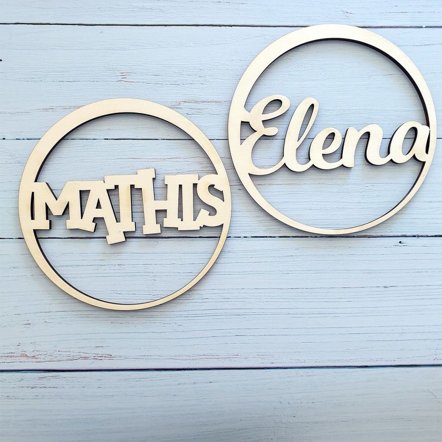 Décoration murale en bois de 19 cm de diamètre environ avec 1 ou 2 prénoms. (Épaisseur 6mm)