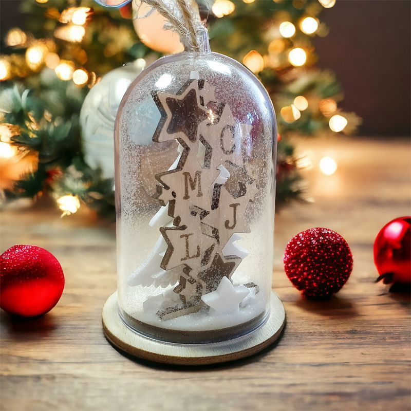 Cloche transparente en plastique de haute qualité remplie de déco personnalisée avec les initiales de votre famille.