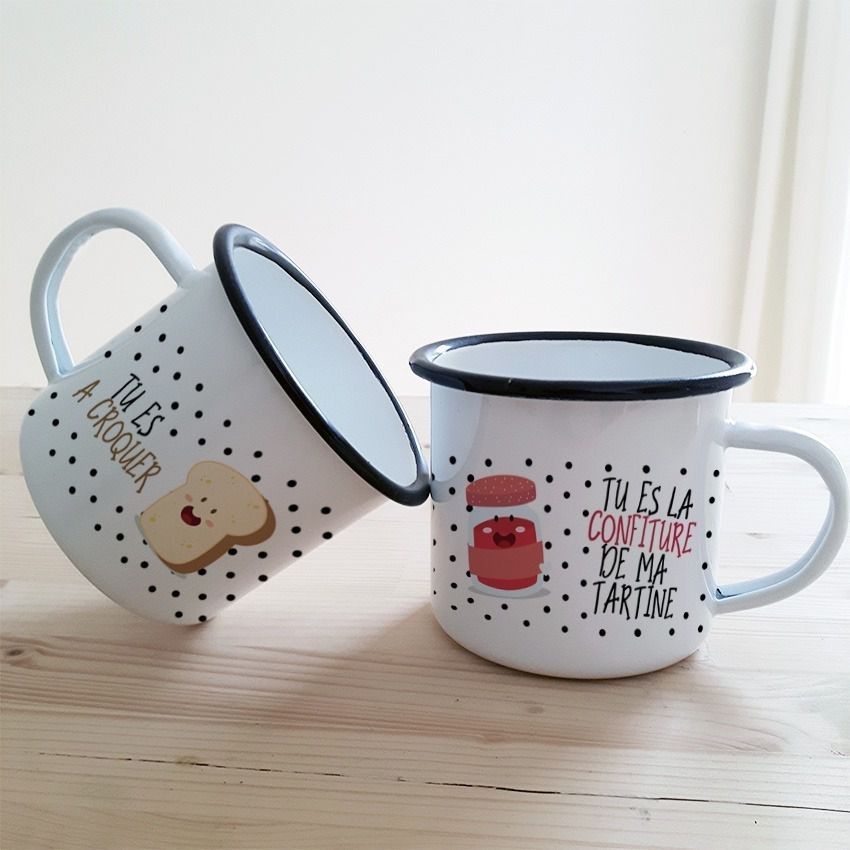 Duo de tasses émaillées (recto/verso) pour couple modèle "Tartine & confiture"
