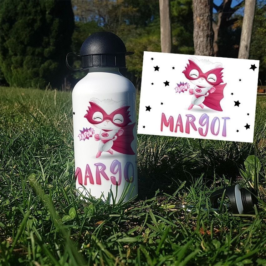 Gourde ou bouteille personnalisée pour enfant modèle Super chat (rose)