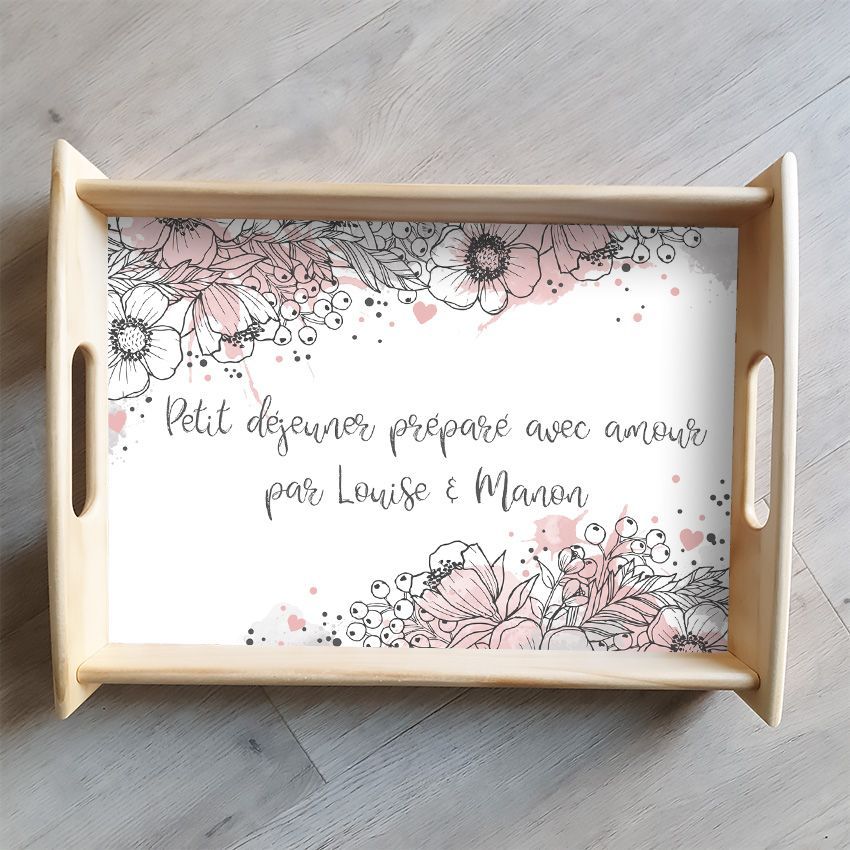 Grand plateau bois personnalisé fleuri avec texte