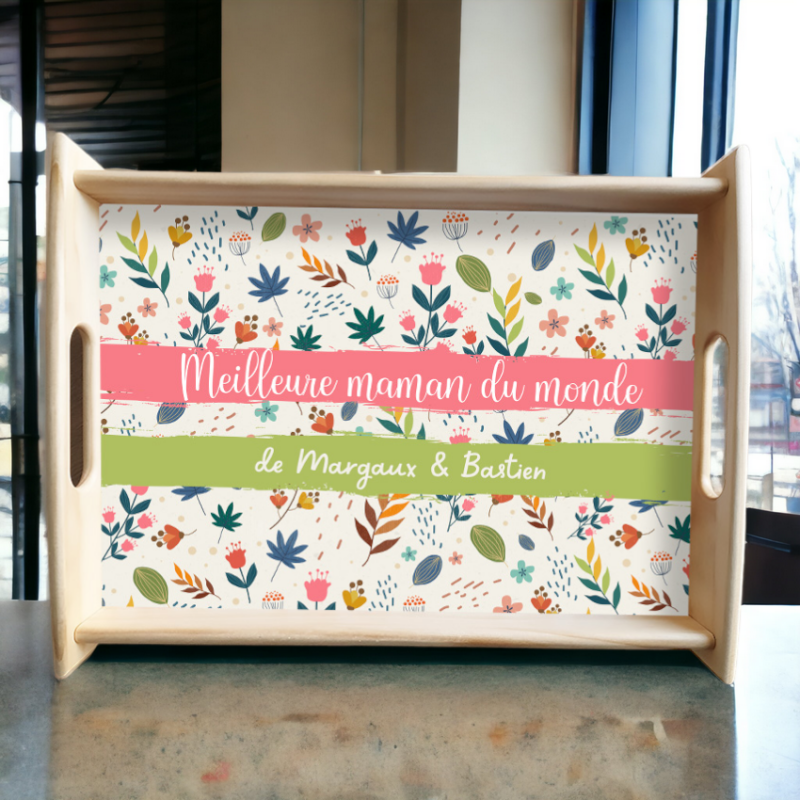 Grand plateau bois personnalisé fleuri avec texte - 4 couleurs au choix