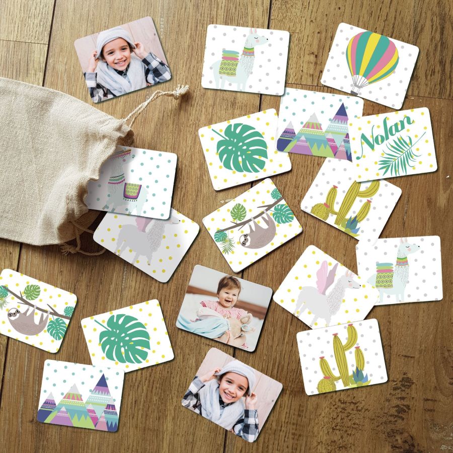Jeu de mémoire modèle Lamas, comprenant 4 cartes personnalisées (2x2) dont une photo (de l'enfant ou de sa famille par exemple) et un carton avec son prénom.