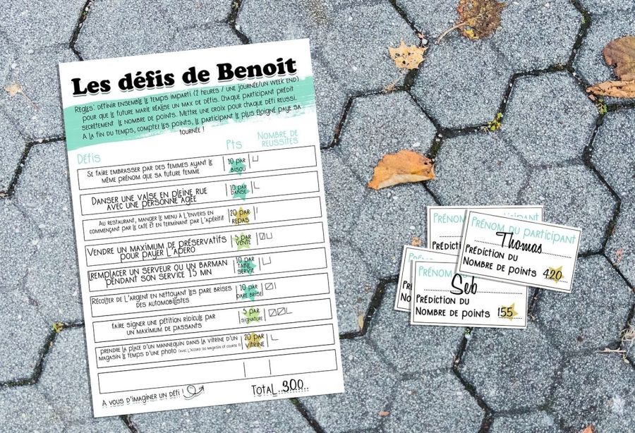 *La fiche de comptage de points avec les défis (dont une case libre pour inscrire votre défi) personnalisé au prénom du futur marié - Impression sur papier 160gr