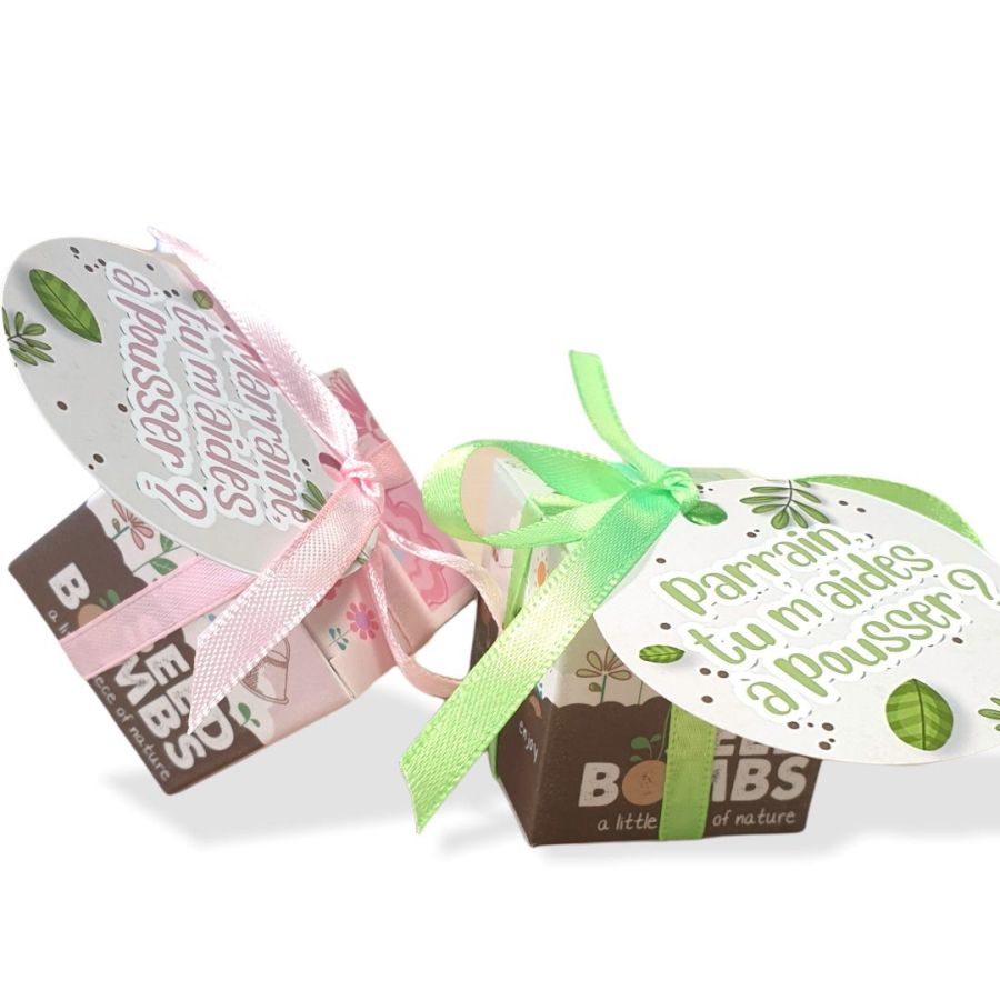 Mini bombes à graines de fleurs sauvages dans une ravissante petite boîte avec étiquette pour faire la demande aux parrain/marraine (message non personnalisable)