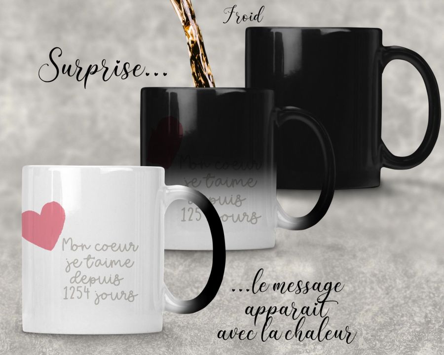 Mug noir à effet thermo-magique. Il devient blanc au contact de la chaleur et laisse apparaitre votre message.