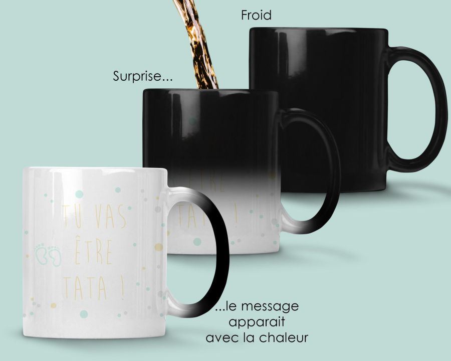 Mug noir à effet thermo-magique. Il devient blanc au contact de la chaleur et laisse apparaitre votre message.
