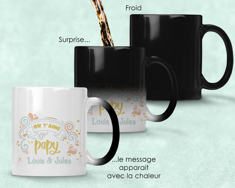 Versez votre Thé chaud et le mug changera de couleur pour devenir blanc et laisser apparaitre un message.