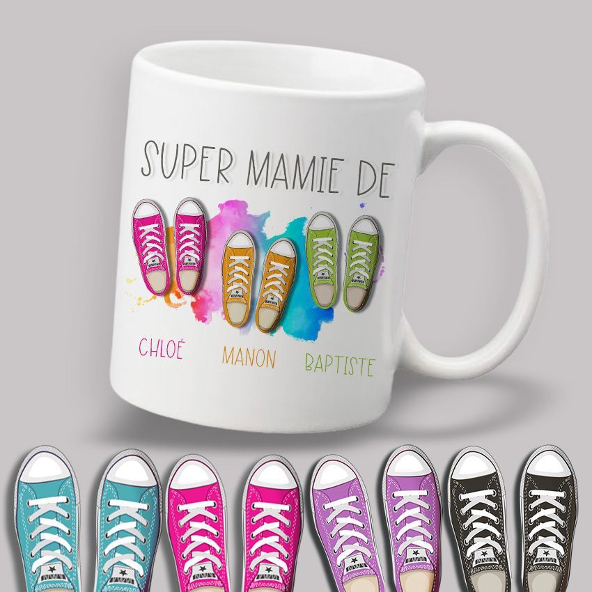 Voilà un mug original à personnaliser avec les prénoms des enfants ou petits enfants pour faire un cadeau à une super Mamie ou à un Super Papi !