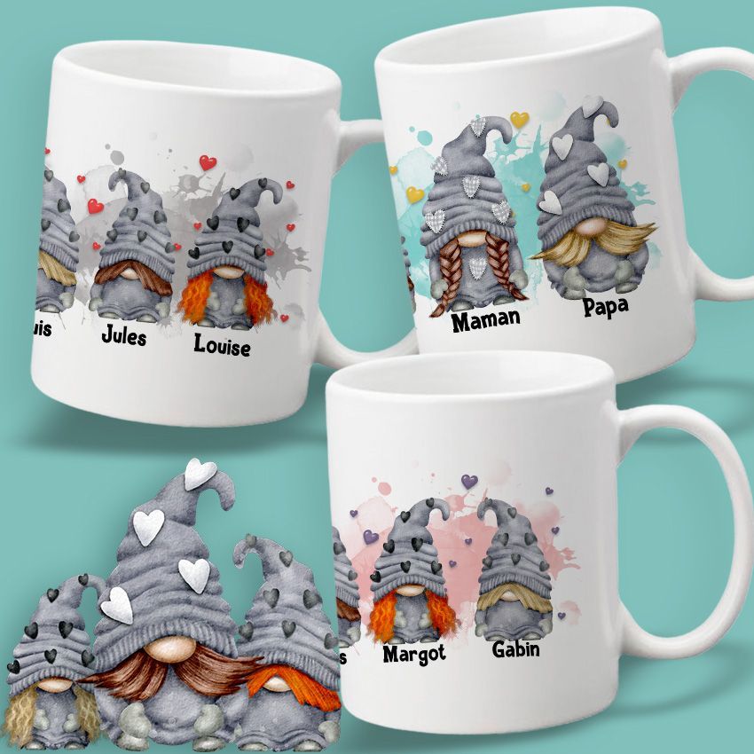 Un cadeau original et personnalisé, pour représenter toute une famille sous forme de Gnomes sur un Mug.