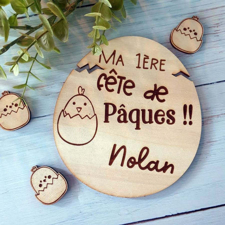 Il est encore un peu trop jeune pour goûter les bons chocolats, mais pourquoi ne pas le prendre en photo avec ce petit oeuf gravé en bois et personnalisé avec votre texte ?