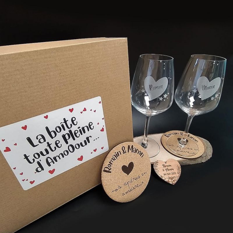 Un pack complet composé d'un duo de verres à vin gravés à vos prénoms, accompagné de deux dessous de verre et un magnet en bois avec vos prénoms et date de rencontre ou mariage !