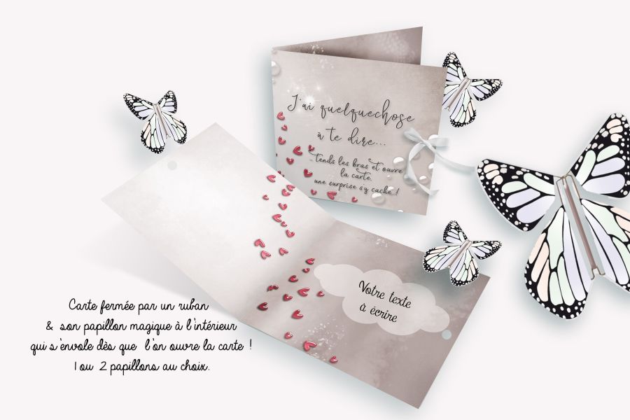 Une double carte qui renferme un joli message et un papillon qui s'envole à l'ouverture de la carte !