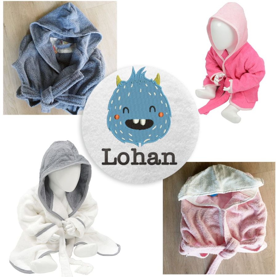 Adorable peignoir éponge pour enfant brodé avec son nom et une illustration de monstre bleu qui mesure 6x8 cm
