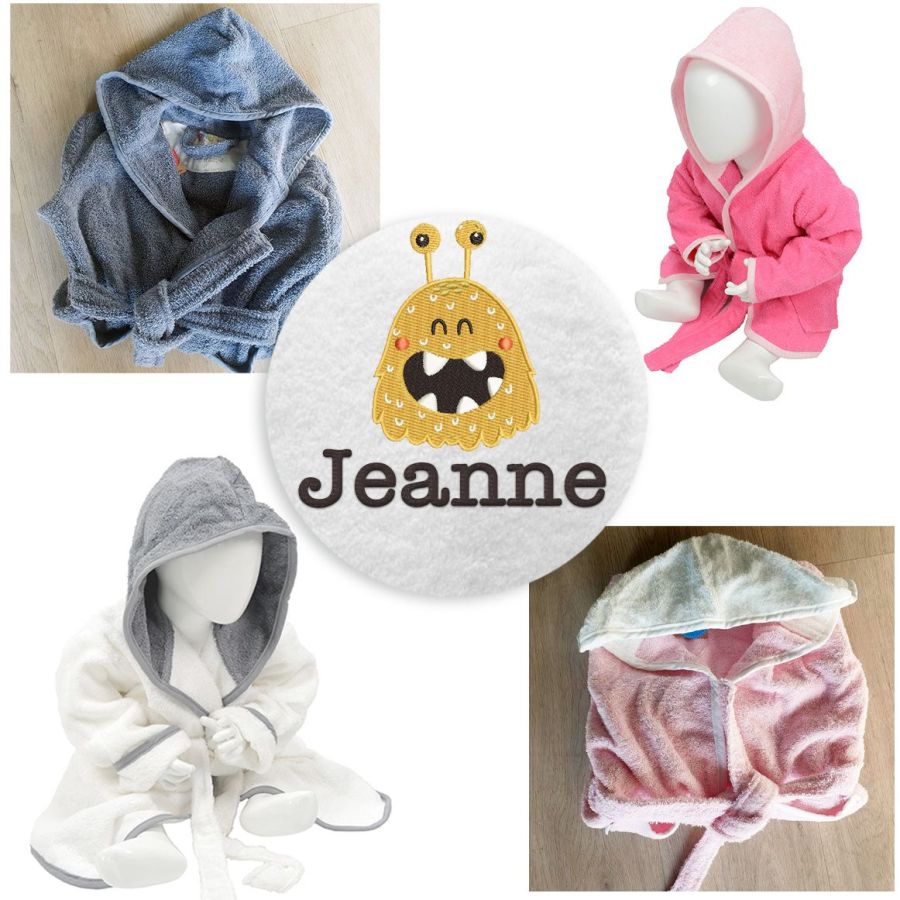 Adorable peignoir éponge pour enfant brodé avec son nom et une illustration de monstre jaune qui mesure 6x8 cm