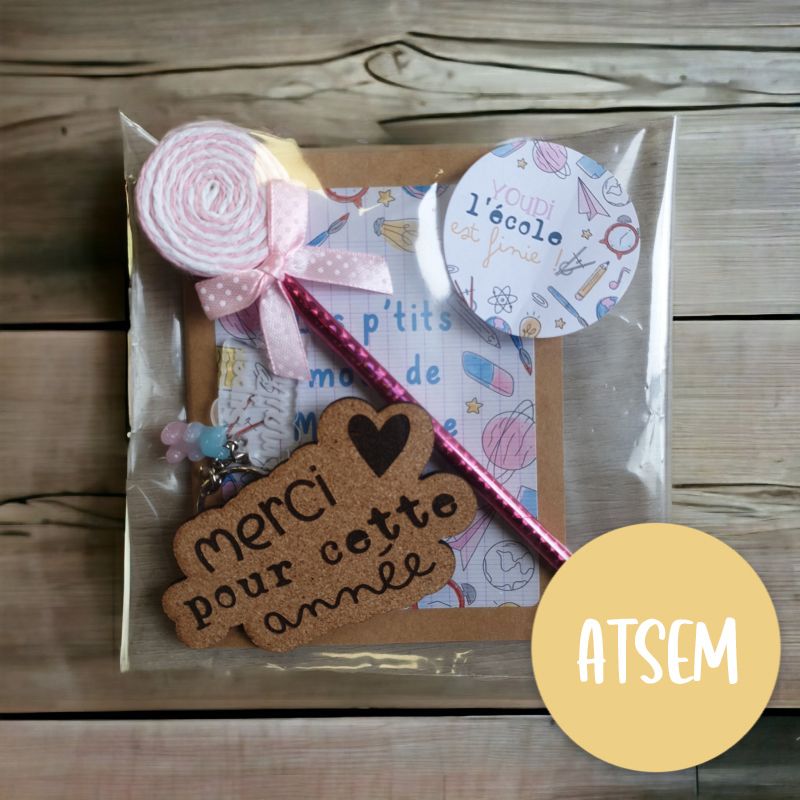 Pochette cadeau personnalisé pour l'ATSEM de votre enfant. Ce pack comprend plusieurs articles dont un petit calepin personnalisé avec le texte de votre choix.