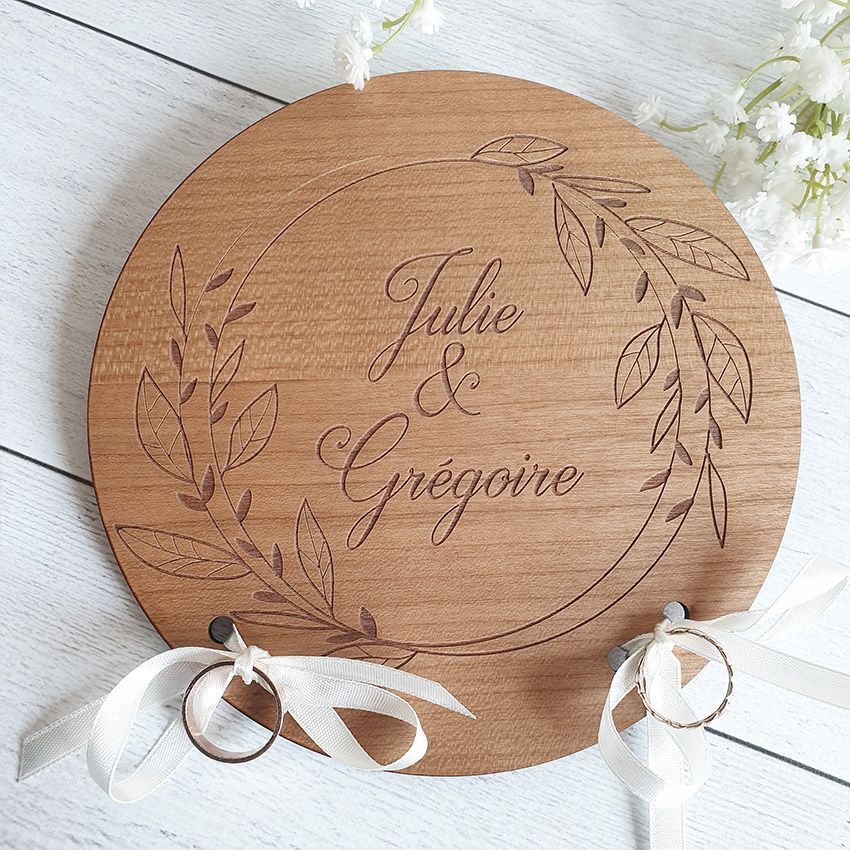 Pour une alternative originale à la boîte à alliance, nous vous proposons ce superbe porte alliances en bois ou en plexiglass, gravé et personnalisé avec les prénoms et la date du mariage.
