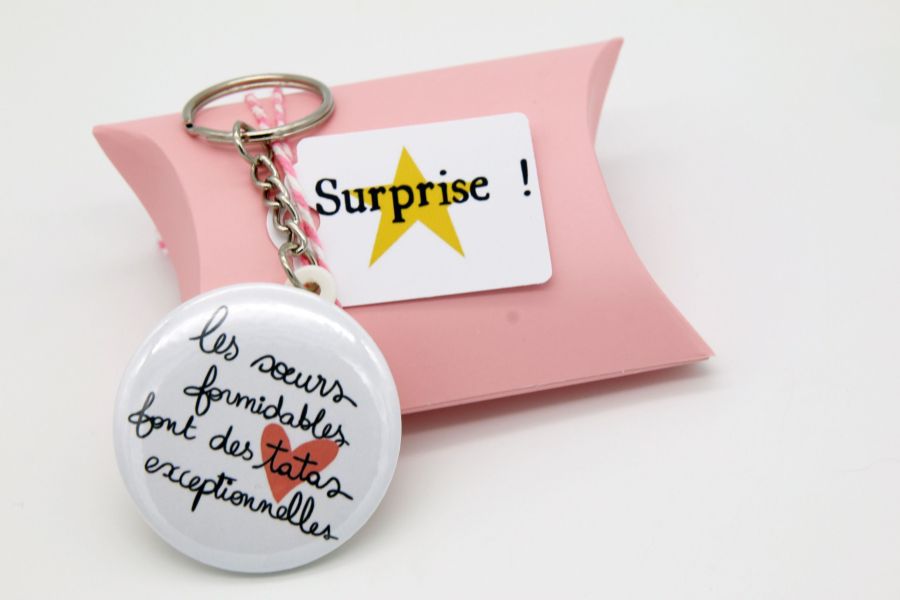 Le porte clé sera livré avec une pochette cadeau couleur aléatoire (livrée à plat) et une étiquette surprise !