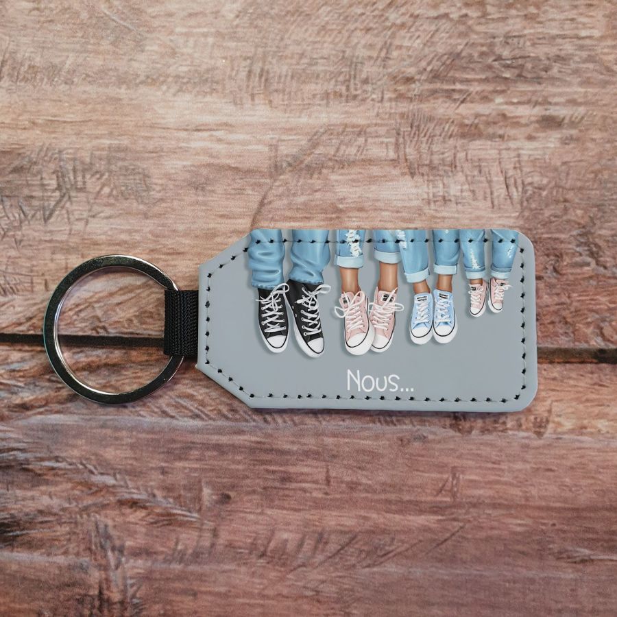 Porte clé en cuir synthétique imprimé avec votre famille représentée par vos baskets (et pattes d'animaux)
