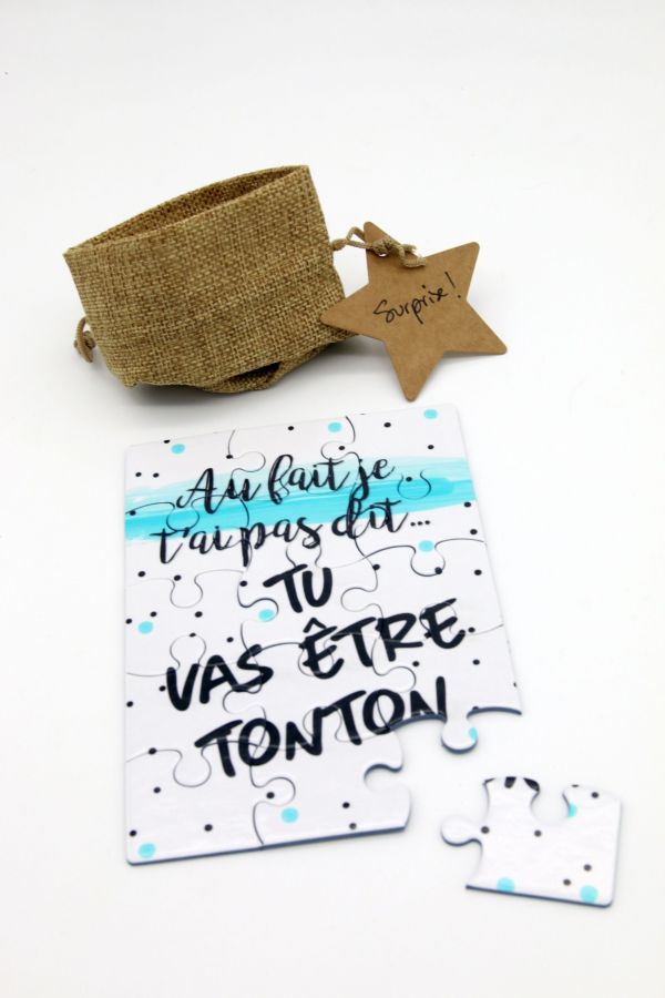 Annoncez de façon originale votre grossesse au futur Tonton! Offrez lui ce puzzle emballé dans son ballotin en coton.