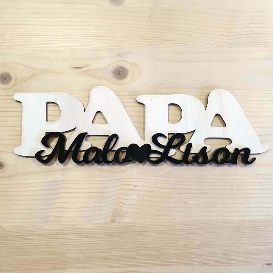 Le mot Papa en bois en fond et les prénoms des enfants en plexiglass de la couleur de votre choix