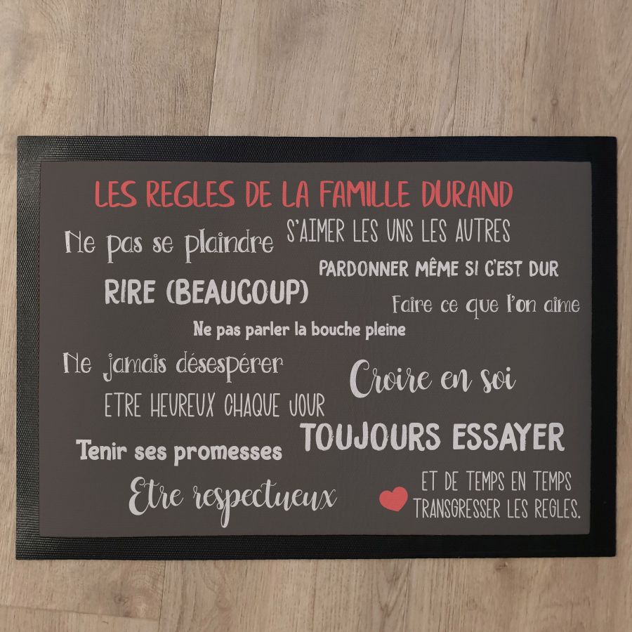 Vous cherchez un tapis de sol personnalisé qui mettra tout de suite vos invités au courant des bonnes pratiques de votre foyer ? Offrez ce paillasson personnalisé "Les règles de la famille"