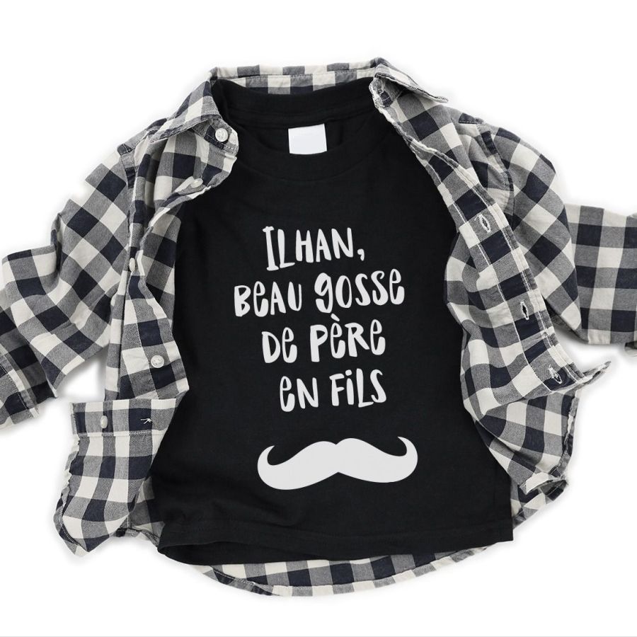 Tee shirt enfant personnalisable avec propre texte de 7 mots maximum. La moustache sera présente merci de nous dire si vous ne la souhaitez pas