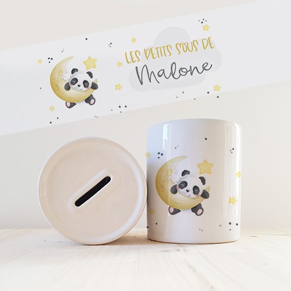 Tirelire en céramique personnalisée avec le prénom de l'enfant ou un petit texte.