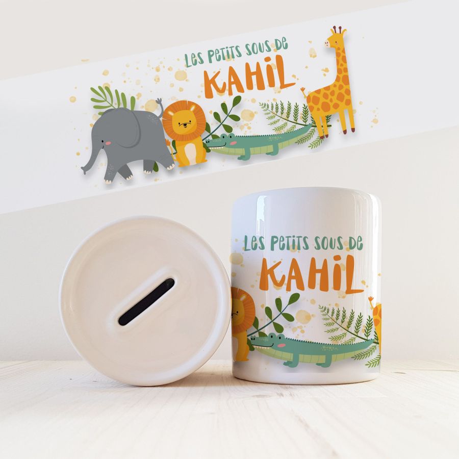 Tirelire en céramique personnalisée avec le prénom de l'enfant ou un petit texte.
