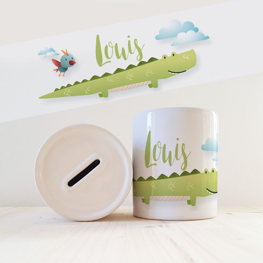 Tirelire en céramique personnalisée avec le prénom de l'enfant ou un petit texte.