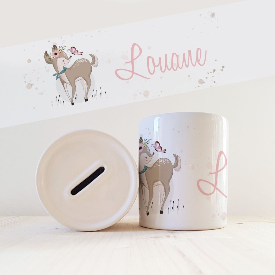 Tirelire en céramique personnalisée avec le prénom de l'enfant ou un petit texte.